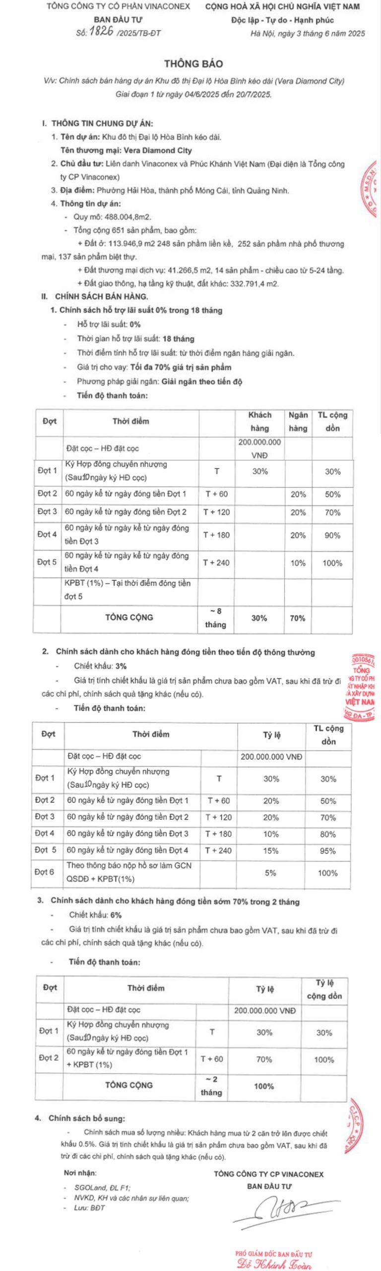 Chủ đầu tư dự án Vera Diamond City là Liên danh Vinaconex và Phúc Khánh Việt Nam (đại diện chủ đầu tư là Tổng công ty CP Vinaconex.